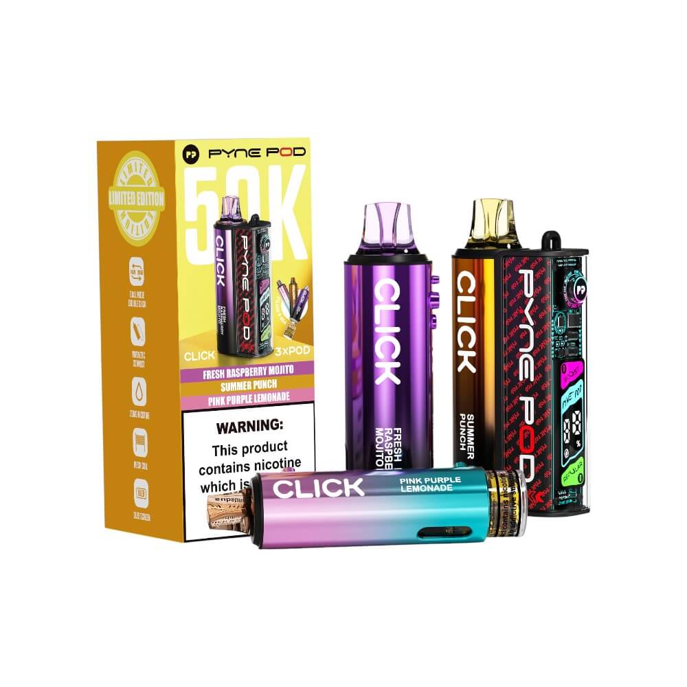 Welcome to the future of vaping with the Pyne Pod Click 50K, the ultimate device designed to deliver massive flavour and next-level convenience like never before. Say goodbye to messy refills and complicated setups - Pyne Pod Click 50K blends cutting-edge technology with premium, flavour-packed E-liquid for a seamless, satisfying vape experience that simply Clicks with you.