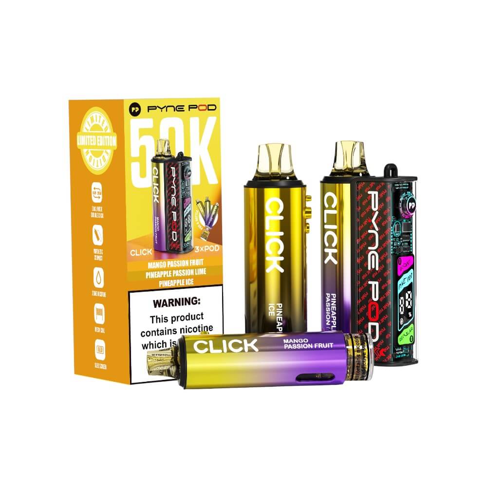 Welcome to the future of vaping with the Pyne Pod Click 50K, the ultimate device designed to deliver massive flavour and next-level convenience like never before. Say goodbye to messy refills and complicated setups - Pyne Pod Click 50K blends cutting-edge technology with premium, flavour-packed E-liquid for a seamless, satisfying vape experience that simply Clicks with you.